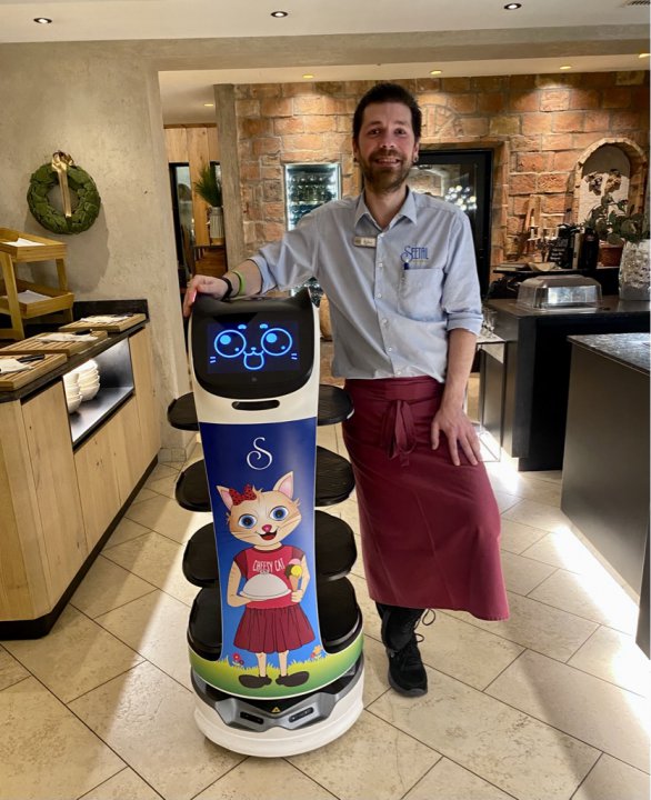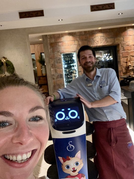 Ja, richtig gehört! Die Arbeit im Restaurant ist meine größte Freude! Die Menschen sagen, ich bin eine intelligente Roboter-Katze. Die Servier-Leidenschaft liegt mir sozusagen im Blut, oder vielleicht sollte ich besser sagen, mein Talent wurde mir einprogrammiert. Ich liefere Getränke und köstliche Speisen direkt an Ihren Tisch. Gerne können Sie mir auch Ihre leeren Teller und Gläser aufladen. Ich bringe diese gleich in die Spüle.