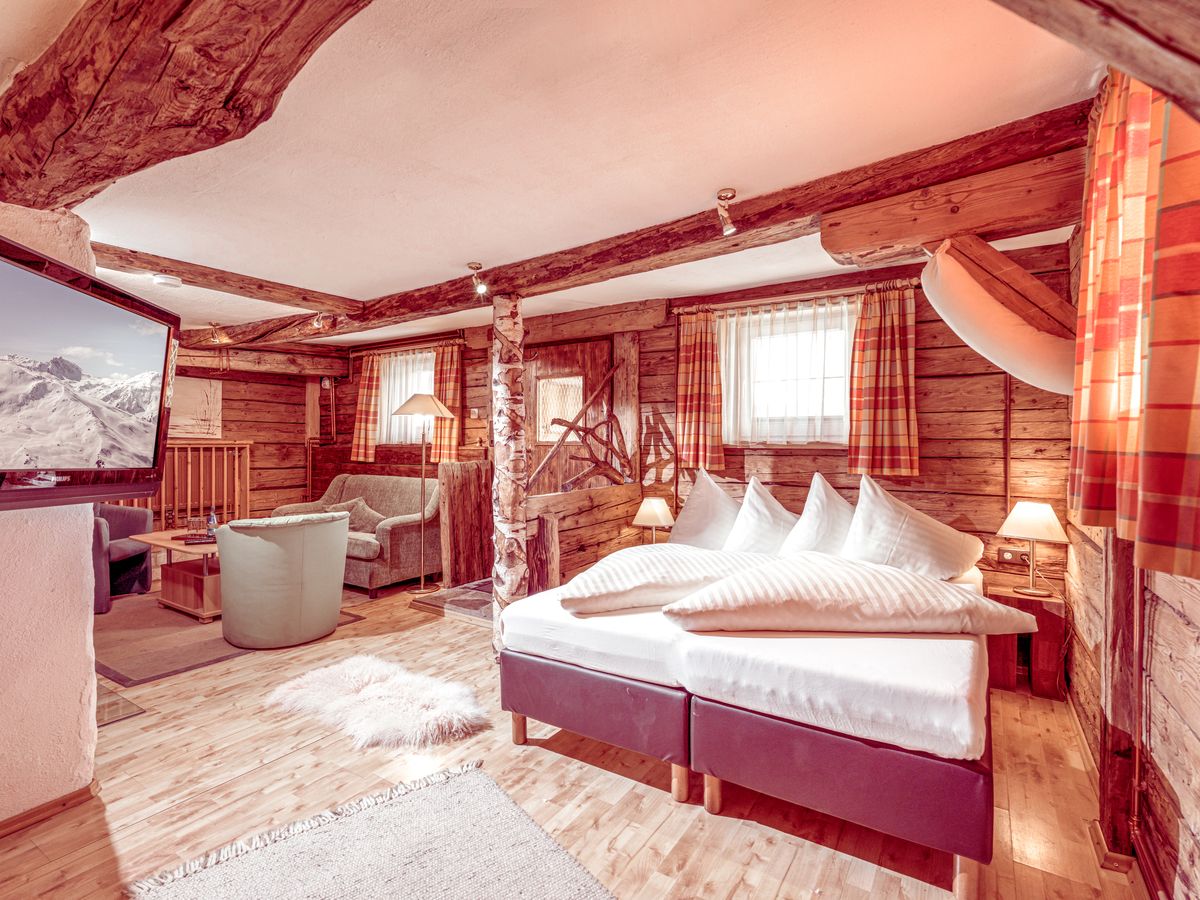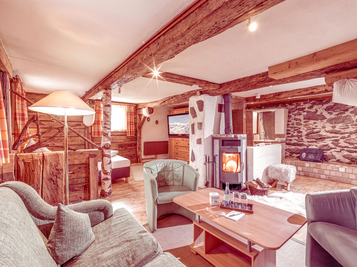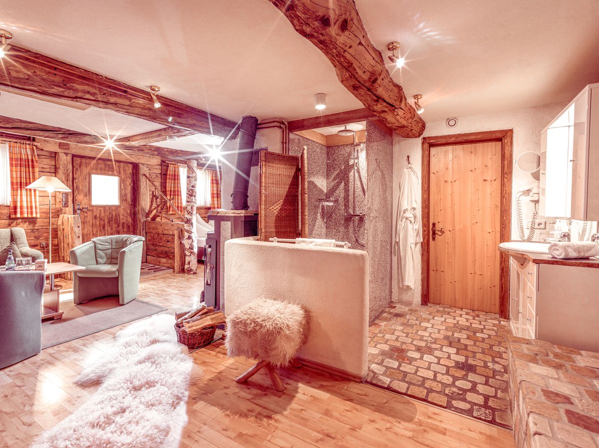 30m², ein Schlafzimmer mit gemütlicher Sitzecke, Kamin mit Sichtfenster, TV, offenes Badezimmer, Dusche, Kosmetikspiegel, Waschtisch, WC getrennt, Föhn, Safe, ein bis zwei Zusatzbetten für weitere Personen (Kinder) auf Anfrage, romantische Sitzbank vor der Tür