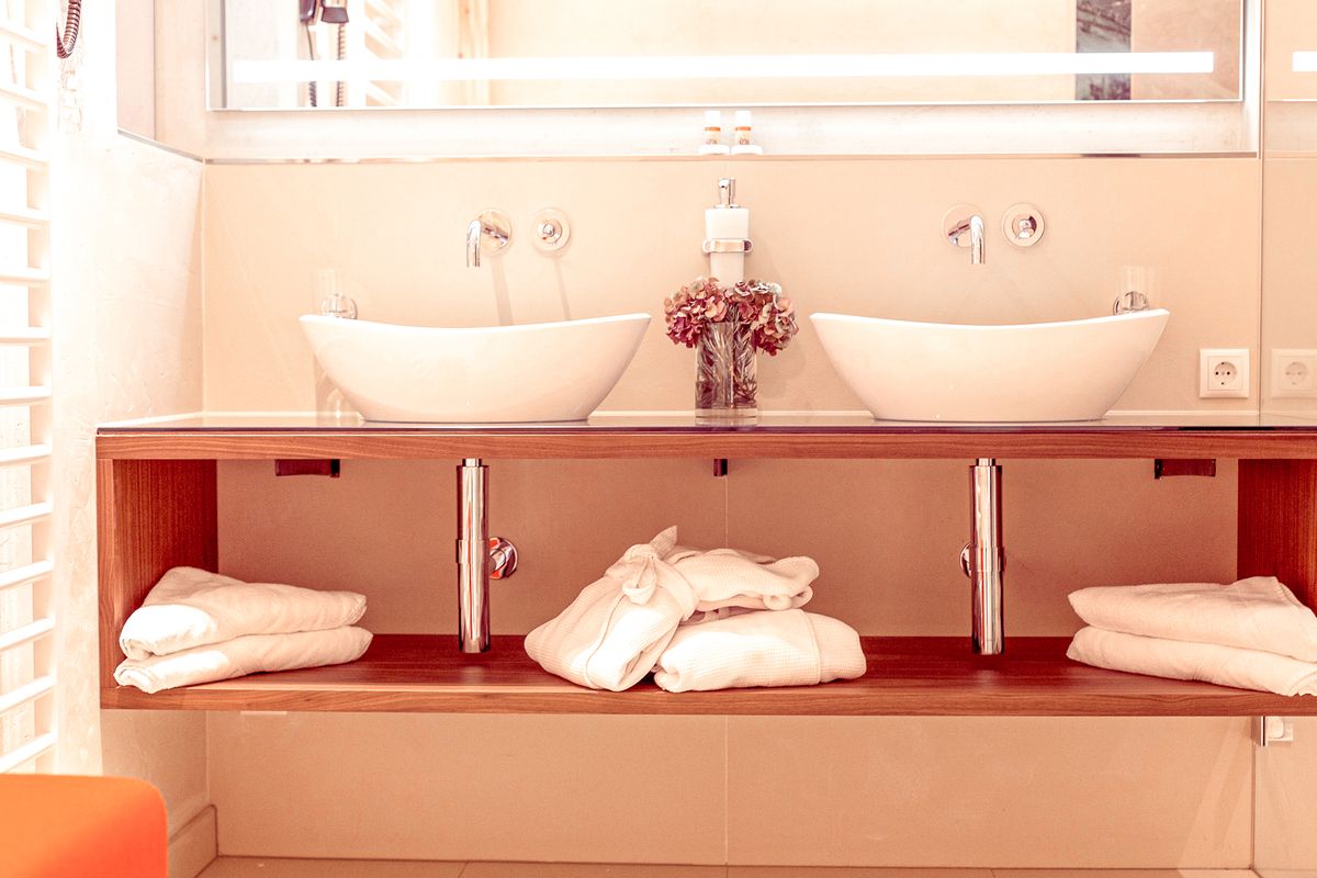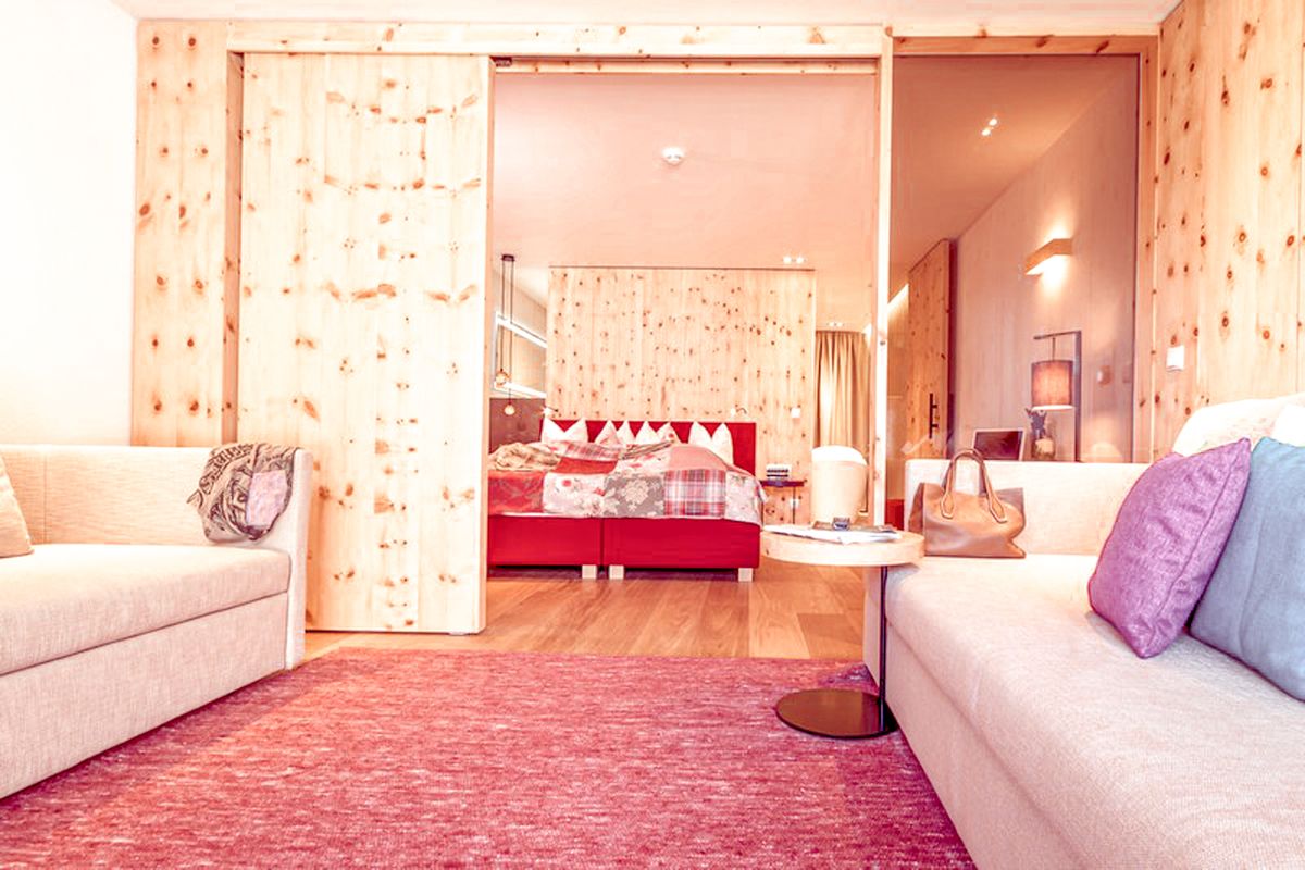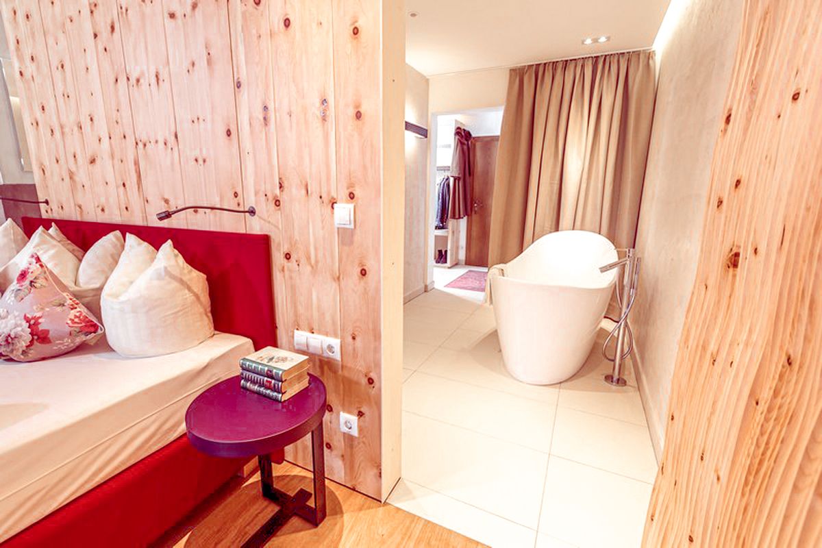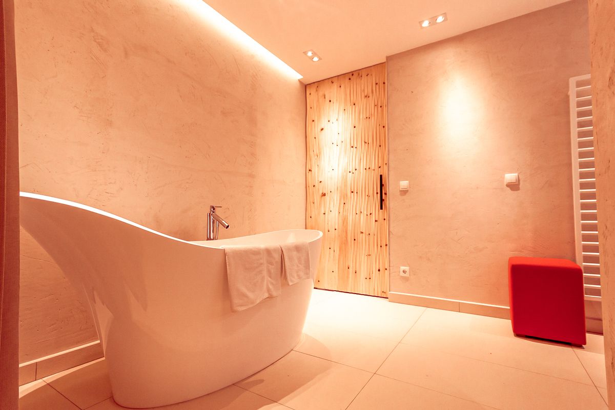45 m², Doppelwaschtisch, freistehende Badewanne, Dusche, Föhn, Kosmetikspiegel, WC extra, begehbarer Kleiderschrank, abgetrennter Wohnraum (Schlafzimmer für 3.4. Person/Kinder), Couch, Safe, Telefon, 2 Tv und Balkon im 2. und 3. Stock mit Ausblick.