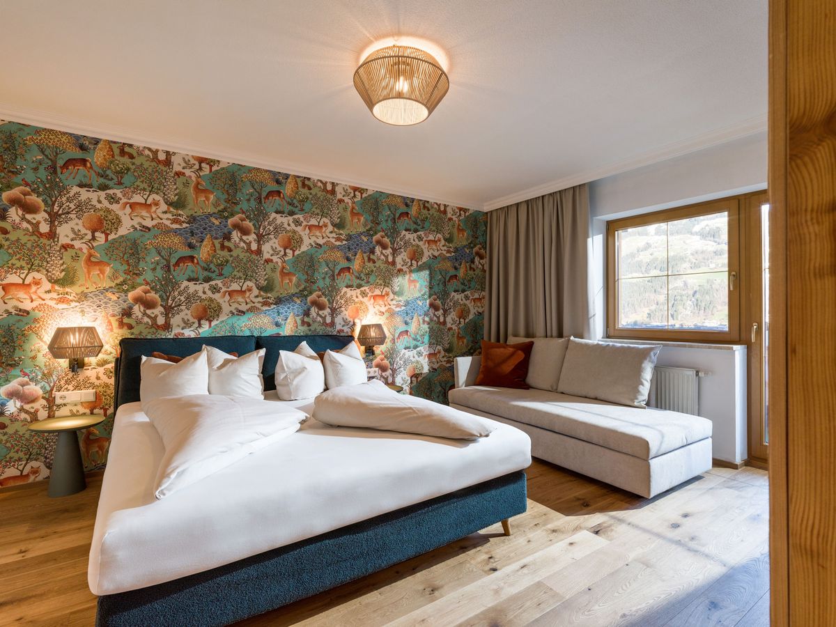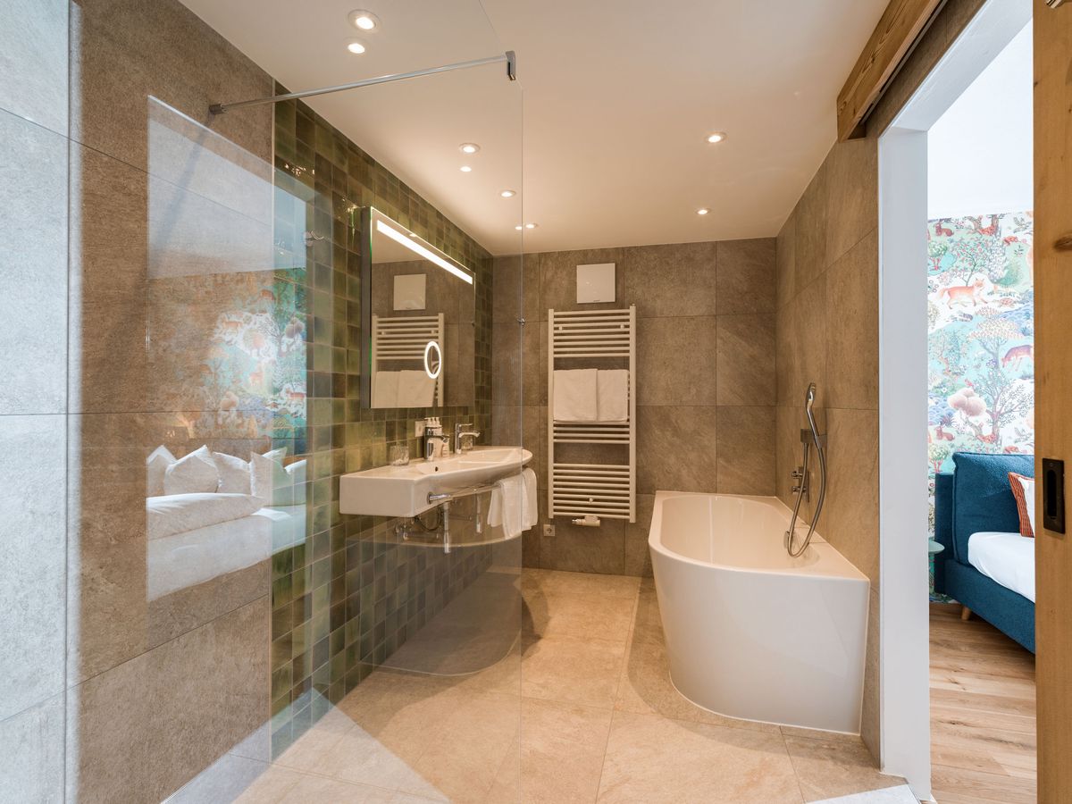 50m², Schlafzimmer mit Sitzgelegenheit, Badezimmer, Badewanne, Dusche, Doppelwaschtisch, Föhn, WC getrennt, Kosmetikspiegel, zwei TV, ein getrenntes 2. Schlafzimmer mit Doppelbett für weitere Personen (Kinder), Telefon, Safe, Klimaanlage, ein großer sonniger Balkon mit schönen Ausblick über Kaltenbach