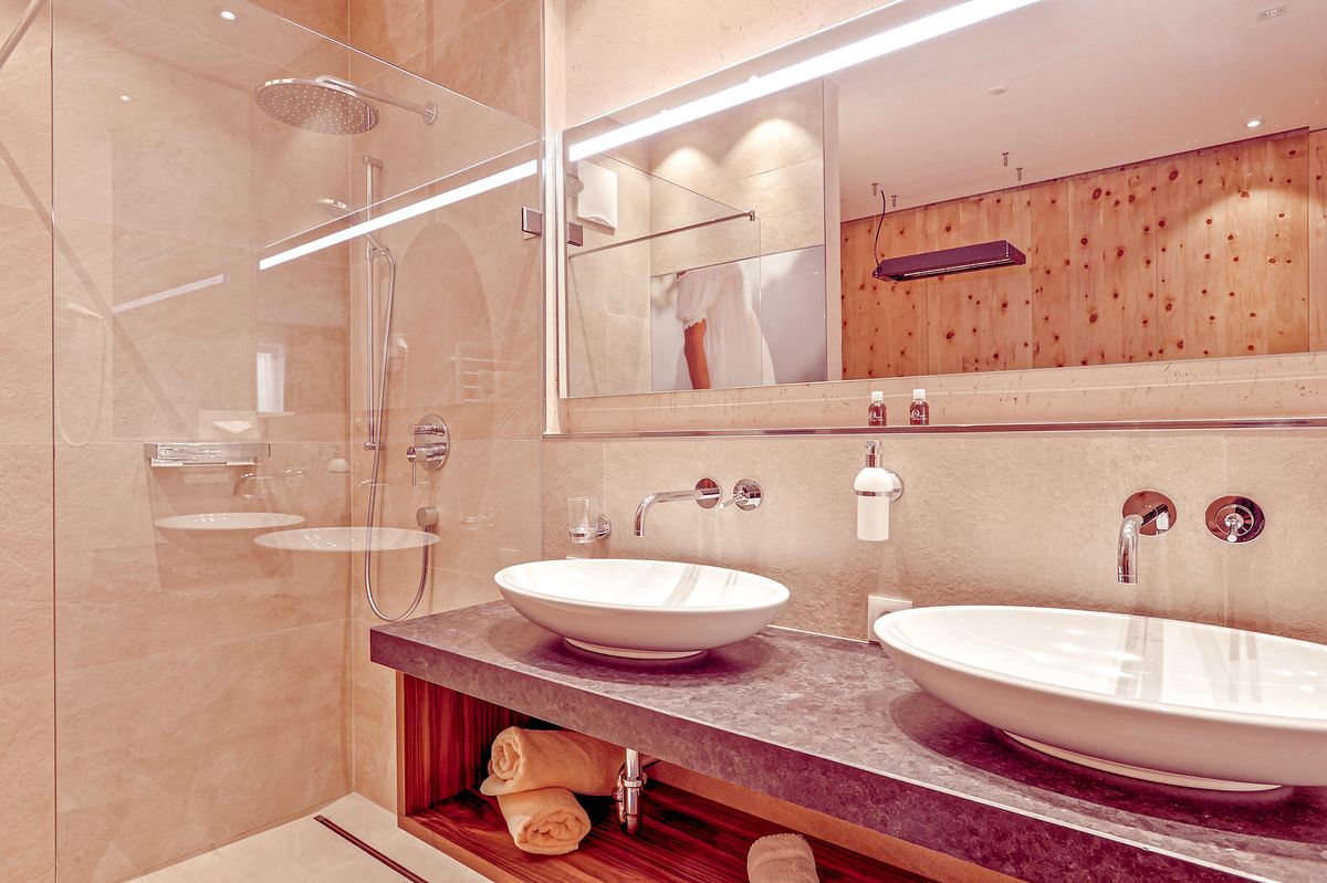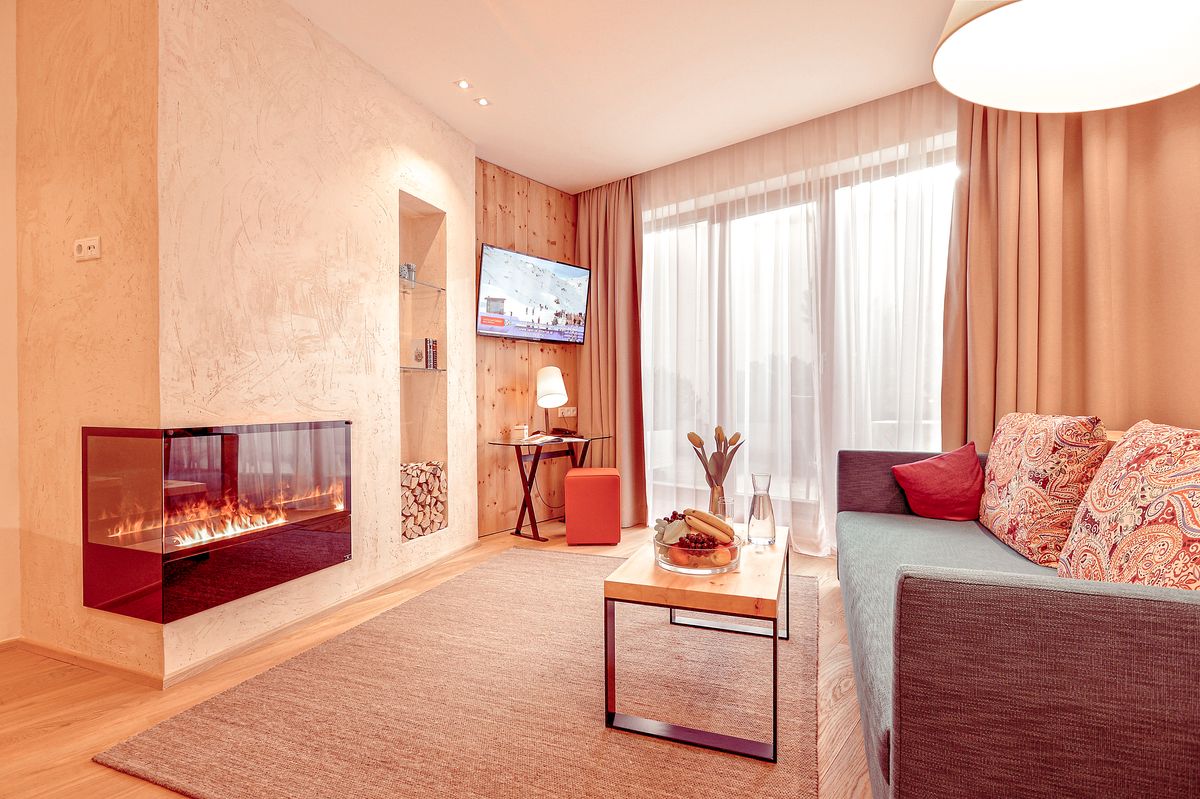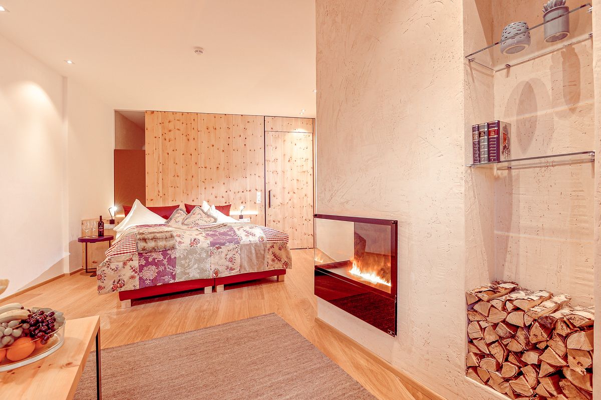 40 m², double vasque, chaise longue à infrarouge, douche, sèche-cheveux, miroir, WC séparé, dressing, salon ouvert(chambre pour une 3ème ou une 4ème personne/enfant), poêle effet flamme, canapé, coffre-fort, téléphone, télévision, petite terrasse donnant sur la cour intérieure.